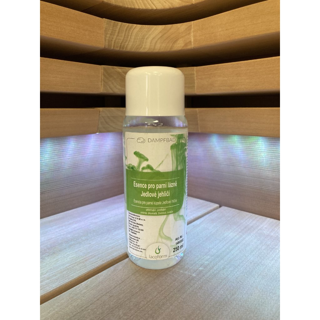Vonná esence Jedlové jehličí určená pro parní lázně. Silná, jehličnatá vůně s lehce sladkým až ovocným nádechem lesních plodů pro dobrou psychickou pohodu. Extrakty z jedlového jehličí mají antidepresivní účinky, povzbuzují, zvyšují koncentraci a upevňují vnitřní rovnováhu. Mají detoxikační, prokrvující a antiseptické účinky. Pro jedinečný zážitek z parní kabiny využijte esence pro parní lázně Lacoform. Parní rázy doplněné o aroma dle Vaší nálady a chuti mají neobyčejné terapeutické účinky. Dávkují se automatickým zařízením pro parní kabiny (injektář do parního potrubí). Dávkování: Dbejte prosím pokynů výrobce těchto zařízení, ideálně používejte náš Lacodos IT plus. Při použití tohoto dávkovače vystačí 1 l esence při plném provozu v kabině o velikosti 20 m2 je přibližně pouze 1 l týdně. V soukromé parní kabině, kde není automatický dávkovač, lze nakapat vždy 2 – 3 kapky na odpařovací trysku.Doplňkové parametry