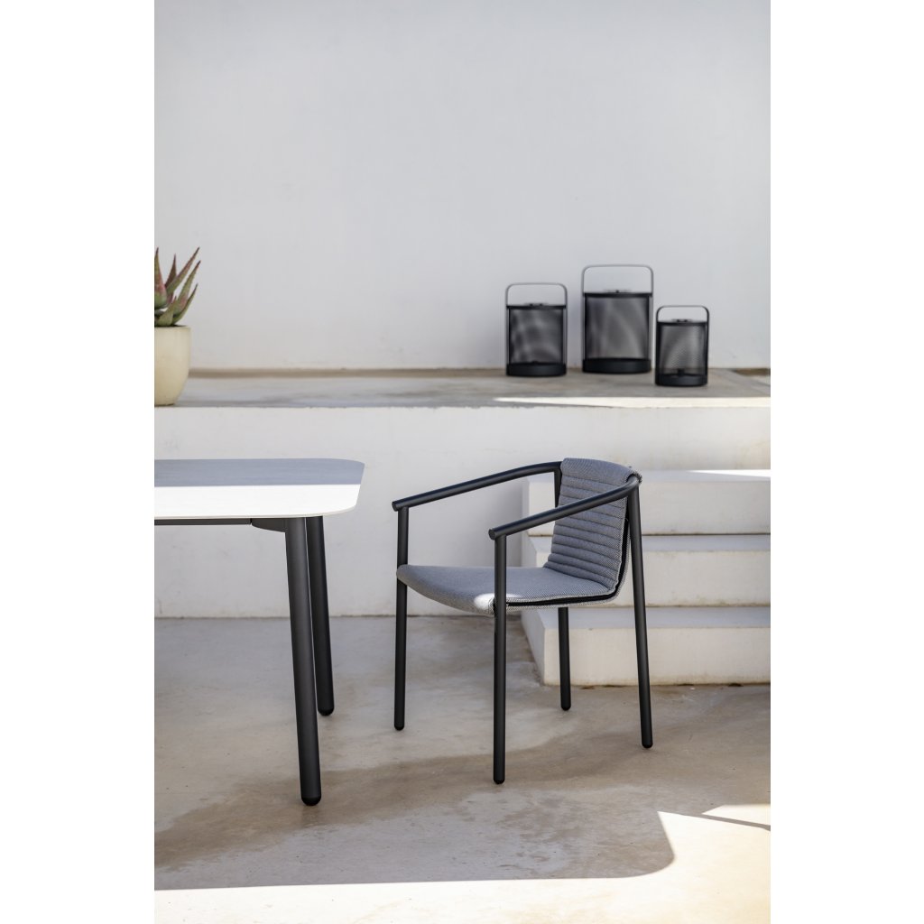 Nerezové zahradní jídelní křeslo Duct značky Todus. Křeslo má rám z práškové lakované oceli a polstrování z venkovní látky s rychleschnoucí výplní. Díky tomu může být zahradní křeslo venku celoročně bez nutnosti chránit je před deštěm. Zahradní křeslo je stohovatelné.