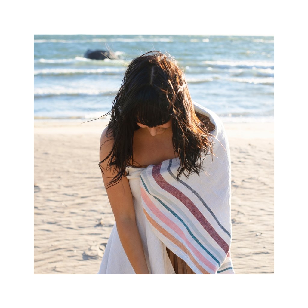 Osuška Lewa je tkaný ze 100% lnu v krásné kombinaci barevných pruhů na bílém podkladu. Len rychle schne a je příjemný na těle. Velkou osušku můžete použít i jako jednoduchý kilt omotáním kolem pasu v sauně a také výborně poslouží i jako plážová osuška k moři.