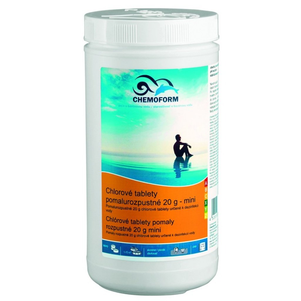 Pomalorozpustné chlorové tablety mini jsou určeny k dlouhodobému nebo k průběžnému chlórování bazénové vody vhodné do bazénů či whirlpoolů do objemu 20m³. Uvolní ve vodě 56% aktivního chlóru. Organické, stabilizované pro všechny stupně tvrdosti vody.