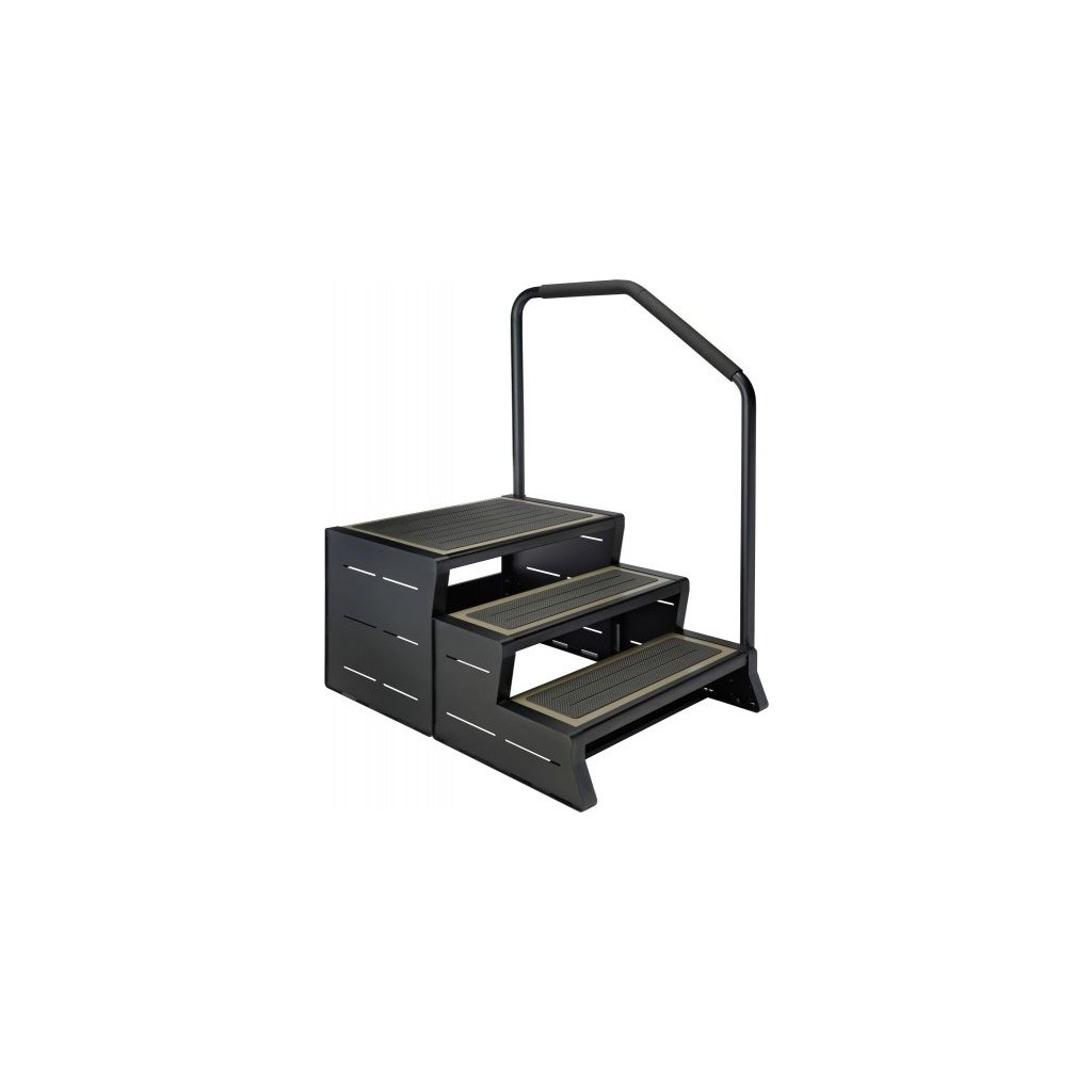 ModStep 3 jsou pevné modulární protiskluzové schody vyrobené technikou vstřikování plastu doplněné o práškově lakovaný hliníkový rám. Kombinujte standardní Modstep 2 se dvěma stupni spolu s komponentou ModStep 3, abyste vytvořili atraktivní a stabilní schody se třemi stupni do Vašich lázní. Jsou odolné proti ÚV záření s dlouhou stálostí barev. Schody jsou vybaveny velkými protiskluzovými nášlapy (30 x 90 cm) pro Vaši bezpečnost. K dispozici je 7 barevných variant, které odpovídají téměř všem vířivým vanám. Díky unikátnímu reverzibilnímu dezénu umožňují umístění k jakékoliv hranaté nebo kulaté vířivce. Doplnit je můžete o SmartDrawery úložné boxy (nejsou součástí balení) ideální pro skladování chemikálií a čistících prostředků pod schody. Dalším atraktivním volitelným doplňkem je solární LED podsvícení, zvyšující bezpečnost. Schody ModStep 3 mohou být vybaveny bočními madly pro lepší vstup do Vašich lázní. Barvy- Black